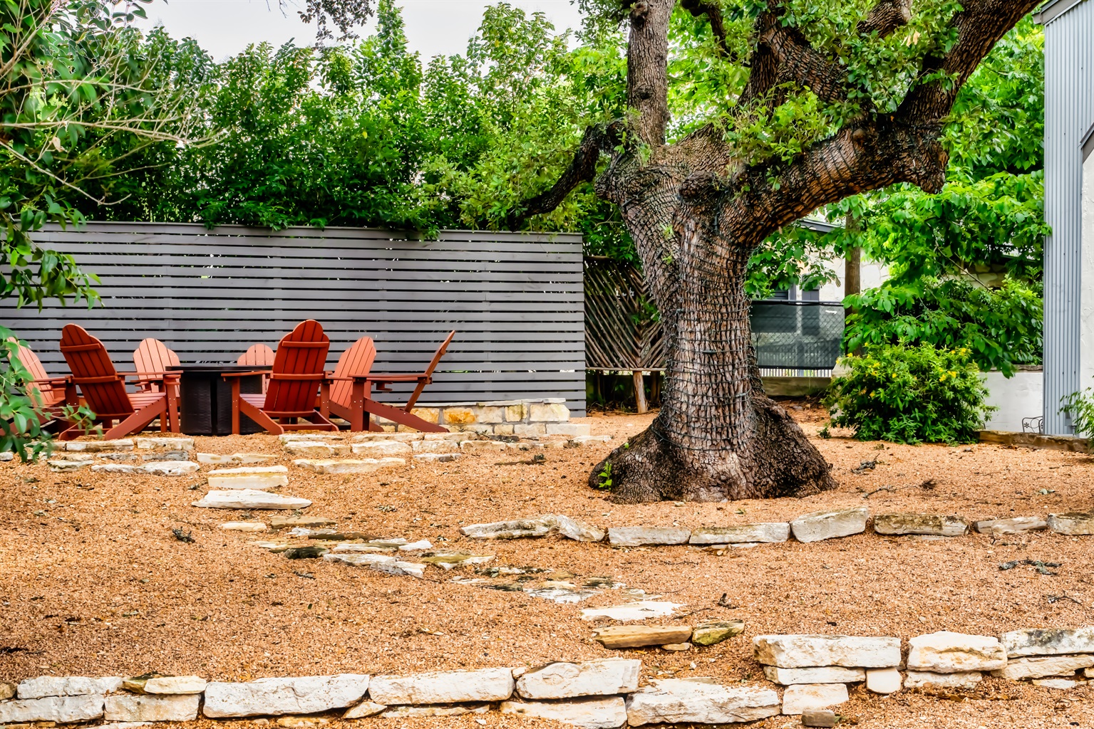 The backyard is secluded with a fire-pit and sitting area, perfect for enjoying the beautiful evenings.