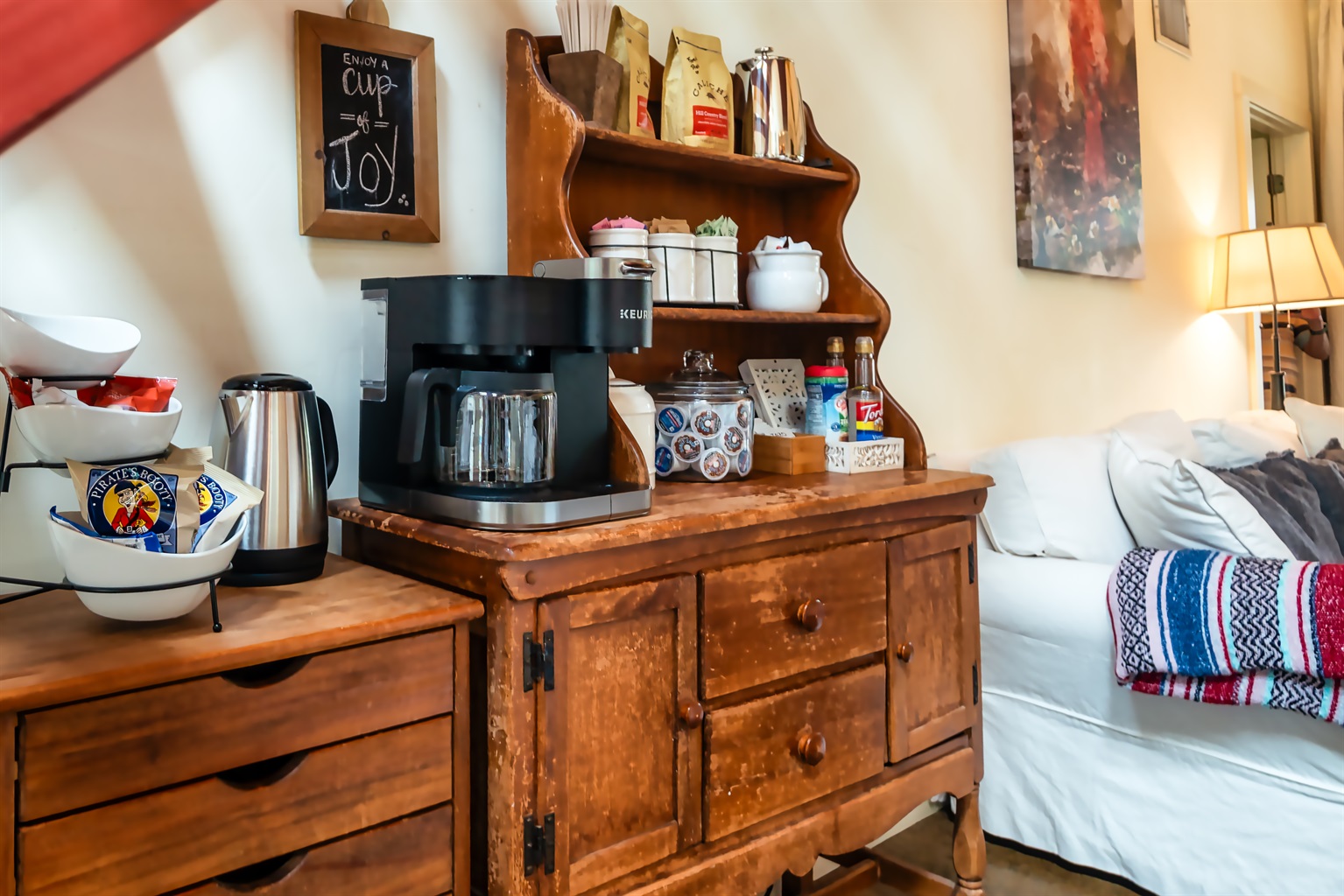 Coffee klatsch with Keurig K-Duo (with pod and drip), a tea kettle, and a French Press provided.